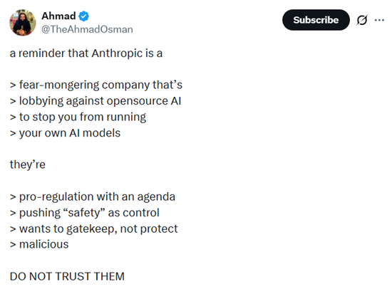 Anthropic是一家散布恐慌的公司,正在游说反对开源人工智能,目的是阻止你运行属于你自己的人工智能模型。