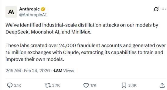 今天凌晨2点,著名大模型平台Anthropic发文传言称,DeepSeek,、Moonshot AI和MiniMax,使用24000个账号,与Claude进行了1600万次交互蒸馏其模型。