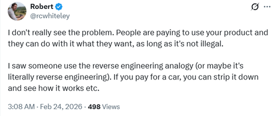 我看到有人用逆向工程打比方。如果你花钱买了一辆车,你可以把它拆开来,研究它的工作原理等等。